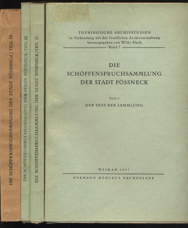 [Grosch, Reinhold / Flach, Willy / Buchda, Gerhard:] Die Schöffenspruchsammlung der Stadt Pössneck. Teil I: Text; Teil II: Studien über die Entstehung; Teil III: Bedeutung der Sammlung; Teil IV: Wort- und Sachregister. [Teil I] bearbeitet von Reinhold Grosch, unter Mitarbeit von Karl Theodor Lauter und Willy Flach. Weimar: Hermann Böhlaus Nachfolger, 1957-1971. 358, 147, 150, 377 S. OBr. (Thüringische Archivstudien; Band 7-10). Ehemalige Bibliotheksexemplare mit Stempeln und entferntem Signaturschild. Teil I-III unaufgeschnitten. [Bestell-Nr. 8094]