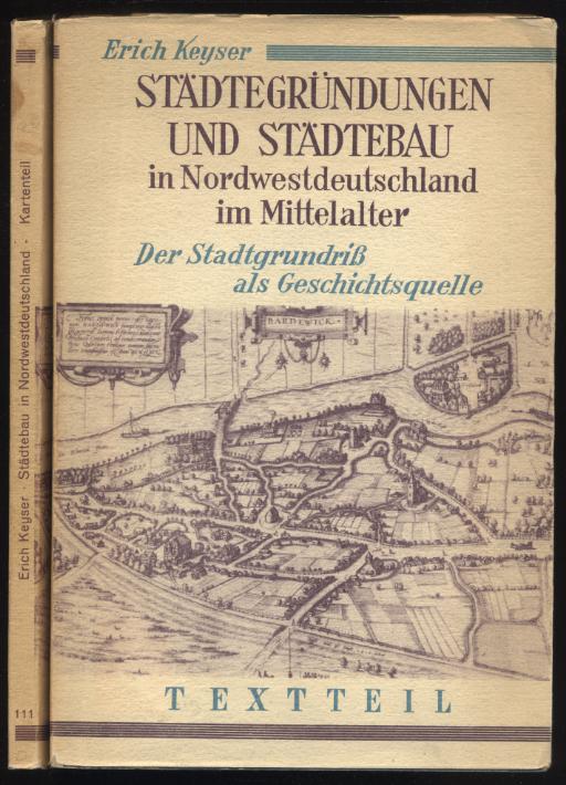 Keyser, Erich: Städtegründungen und Städtebau in Nordwestdeutschland im Mittelalter. Der Stadtgrundriß als Geschichtsquelle. Textteil. Kartenteil. Remagen/Rhein: Selbstverlag der Bundesanstalt für Landeskunde, 1958. 272 S. OBr. OU. (Forschungen zur deutschen Landeskunde; 111). Ehemalige Bibliotheksexemplare mit Stempeln und Signaturschild. [Bestell-Nr. 8095]