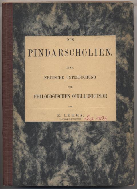 Lehrs, K.: Die Pindarscholien. Eine kritische Untersuchung zur philologischen Quellenkunde, nebst einem Anhange über den falschen Hesychius Milesius und den falschen Philemon. Leipzig: S. Hirzel, 1873. 199 S. Späteres HLn. Wenige Unterstreichungen mit rotem Buntstift. [Bestell-Nr. 8096]