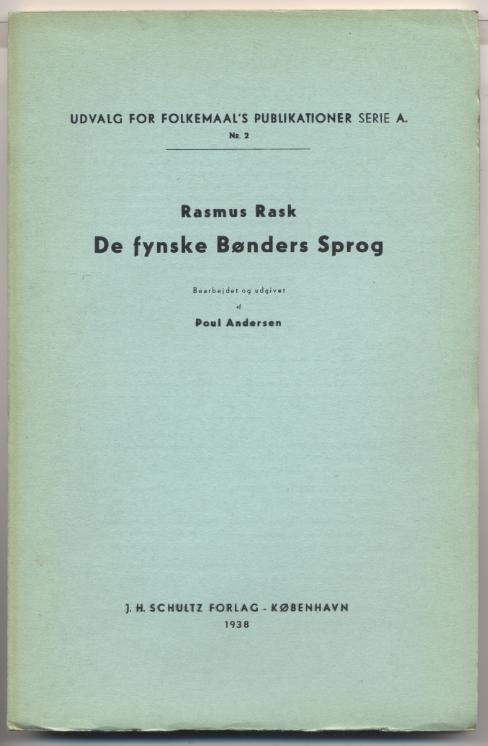 Rask, Rasmus: De fynske Bønders Sprog. Bearbejdet og udgivet af Poul Andersen. København: J.H. Schultz, 1938. 99 S. OBr. (Udvalg for Folkemaal's Publikationer, Serie A; No. 2). [Bestell-Nr. 8100]