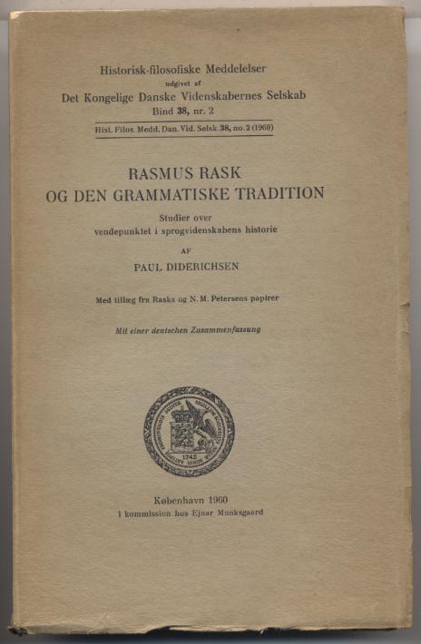 Diderichsen, Paul: Rasmus Rask og den grammatiske tradition. Studier over vendepunktet i sprogvidenskabens historie. København: Ejnar Munksgaard, 1960. 251 S. OBr. Mit einer deutschen Zusammenfassung. (Historisk-filosofiske Meddelser; Bind 38, no. 2). [Bestell-Nr. 8103]