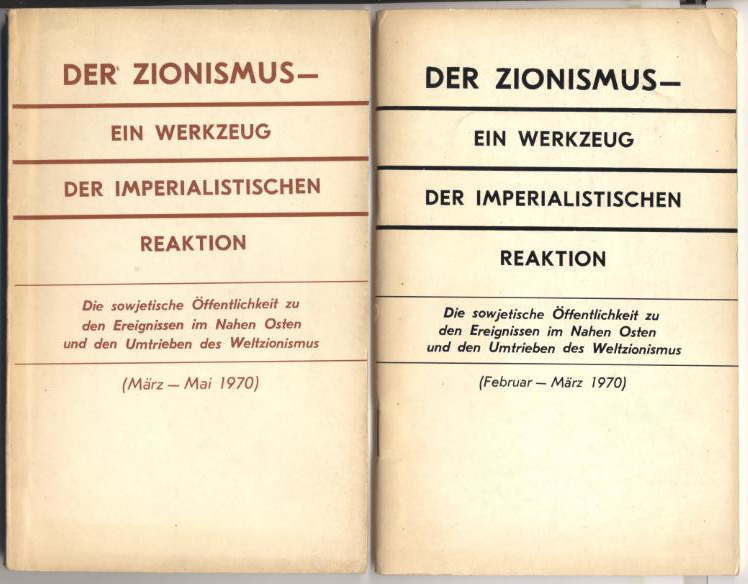 Der Zionismus – Ein Werkzeug der imperialistischen Reaktion. Die sowjetische Öffentlichkeit zu den Ereignissen im Nahen Osten und den Umtrieben des Weltzionismus. (Februar–März 1970, März–Mai 1970). Moskau: APN-Verlag, o.J. [1970]. 87, 147 S. OBr. [Bestell-Nr. 8111]