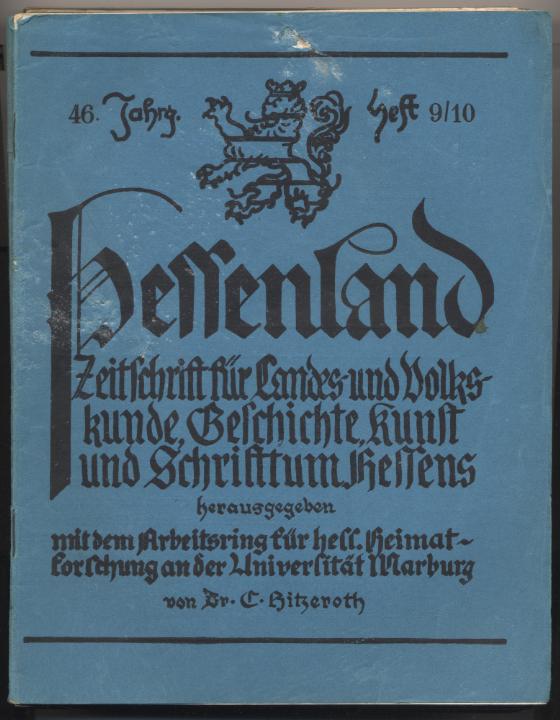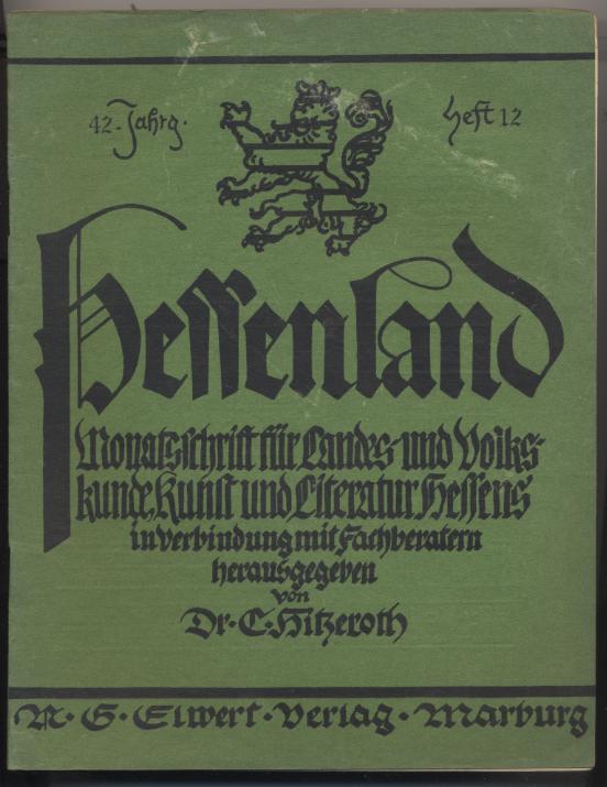 Hitzeroth, C.: Hessenland. 42. Jahrgang. Monatsschrift für Landes- und Volkskunde, Kunst und Literatur Hessens. In Verbindung mit Fachberatern herausgegeben. Marburg: N.G. Elwert, 1931. 384 S. OHeft. Vollständiger Jahrgang. Beilage 'Hassiaca' zu Heft 7 mit Wasserfleck am Schnitt. [Bestell-Nr. 8114]