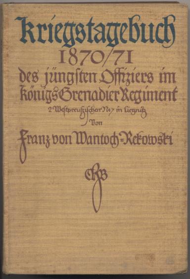 Wantoch-Rekowski, Franz von: Kriegstagebuch des jüngsten Offiziers im Königs-Grenadier-Regiment (2. Westpreußischen) Nr. 7 in Liegnitz. München: C.H. Beck, 1914. 290 S. OLn. Einband leicht fleckig. [Bestell-Nr. 8225]