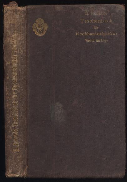 Robrade, Hermann: Taschenbuch für Hochbautechniker und Bauunternehmer. Leipzig: Bernhard Friedrich Voigt, 1902. 348 S. OLn. Abgegriffen, Rücken lädiert: hinteres Gelenk mit Einriss. Vierte verbesserte und vermehrte Auflage. [Bestell-Nr. 8228]