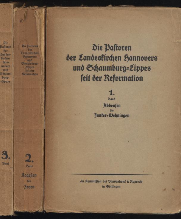 Die Pastoren der Landeskirchen Hannovers und Schaumburg-Lippes seit der Reformation. 1. Band: Abbensen bis Junker-Wehningen; 2. Band: Kaarßen bis Zeven; 3. Band: Ergänzungen und Berichtigungen zum 1. und 2. Bande, Alphabetisches Verzeichnis der Pastoren. Göttingen: Vandenhoeck & Ruprecht, 1941, 1942, 1953. 580, 567, 249 S. OBr. Die beiden ersten Bände etwas stockfleckig, Band 2 Deckel lose. [Bestell-Nr. 8233]