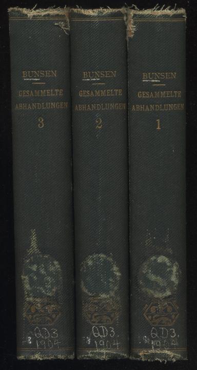 Bunsen, Robert: Gesammelte Abhandlungen. 3 Bände. Im Auftrage der Bunsen-Gesellschaft für angewandte physikalische Chemie herausgegeben von Wilhelm Ostwald und Max Bodenstein. Leipzig: Wilhelm Engelmann, 1904. 535, 660, 637 S. OLn. Exlibris von Charles F. Chandler und The Chemists Club N.Y. bei allen drei Bänden im Innendeckel. Alte Bibliotheksexemplare, abgegriffen. Bei Band 1 beide Gelenke gebrochen: Buchblock lose, bei Band 3 das vordere Gelenk gebrochen. [Bestell-Nr. 8234]