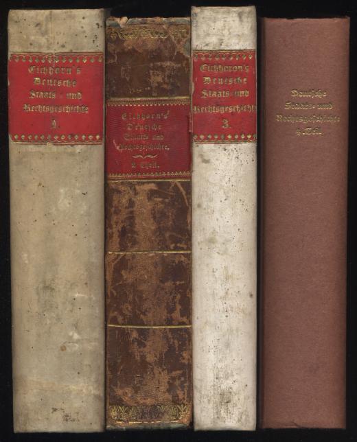 Eichhorn, Karl Friedrich: Deutsche Staats- und Rechtsgeschichte. Vier Bände. Göttingen: Vandenhöck & Ruprecht, 1834-1836. 838, 765, 551, 866 S. Bände abweichend gebunden. Band 2 (HLdr.) Rückengelenke stark berieben. Band 4 Block mit altem Wasserschaden, nachgebunden, moderner Pp. Vierte verbesserte und vermehrte Ausgabe. [Bestell-Nr. 8243]
