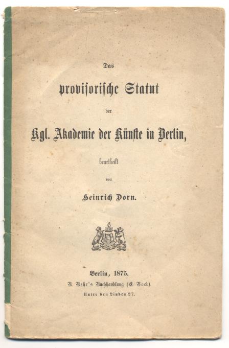 Dorn, Heinrich: Das provisorische Statut der Kgl. Akademie der Künste in Berlin beurteilt. Berlin: B. Behr, 1875. 15 S. OBr. Einriss am Rand. [Bestell-Nr. 8244]