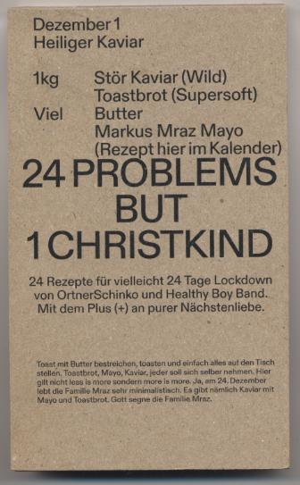 Ortner, Wolfgang: 24 Problems but 1 Christkind. 24 Rezepte für vielleicht 24 Tage Lockdown von OrtnerSchinko und Healthy Boy Band. Linz: 2020. 24 Blätter. OBr. (Gegenstand 2). [Bestell-Nr. 8327]