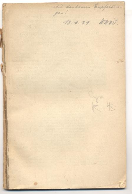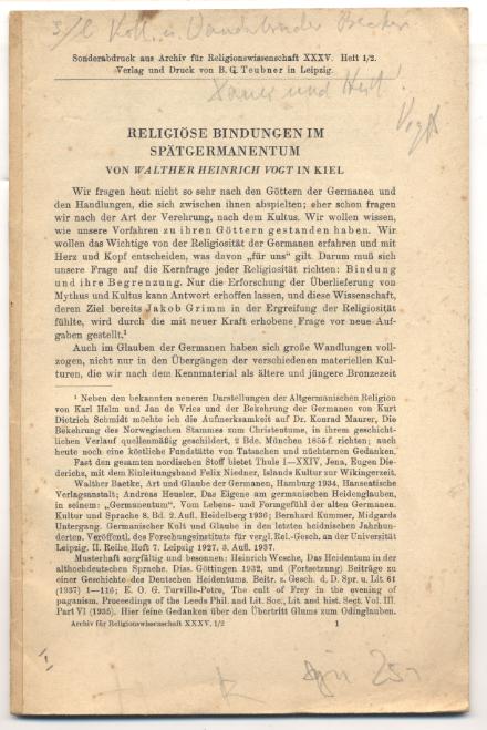 Vogt, Walter Heinrich: Religiöse Bindungen im Spätgermanentum. Sonderabdruck aus Archiv für Religionswissenschaft XXXV, Heft 1/2. Leipzig: B.G. Teubner, 1938. 34 S. OBr. Signiert: Mit knapper Widmung des Autors auf der ersten Seite. [Bestell-Nr. 8179]