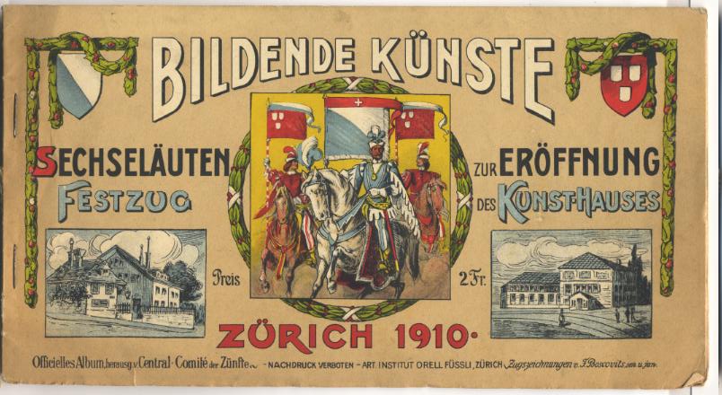 Bildende Künste. Sechseläuten. Festzug zur Eröffnung des Kunst-Hauses. Zugzeichnungen von F. Boscovits. Zürich: Orell Füßli, 1910. OBr. Officielles Album, herausgegeben vom Central-Comite der Zünfte Zürichs. Zahl auf dem hinteren Deckel. [Bestell-Nr. 4407]