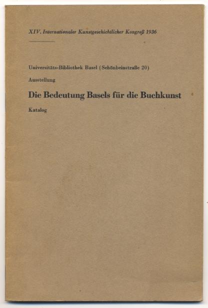 Die Bedeutung Basels für die Buchkunst. Katalog. Basel: 1936. 32 S. OHeft. (XIV. Internationaler Kunstgeschichtlicher Kongreß 1936). [Bestell-Nr. 5186]