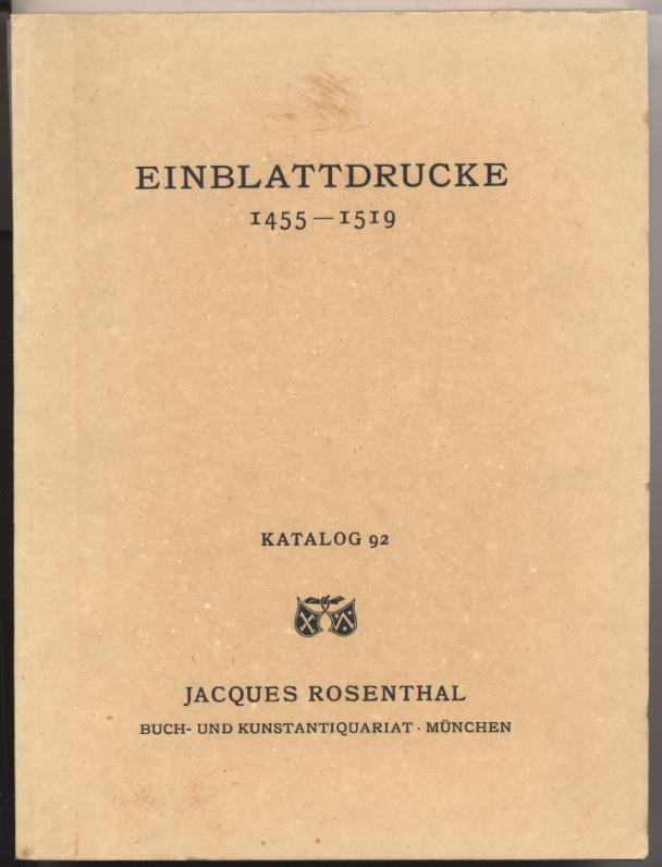 Rosenthal, Jacques: Einblattdrucke 1455-1519. Katalog 92. München: o.J. [1931]. 84 S. OBr. [Bestell-Nr. 5356]