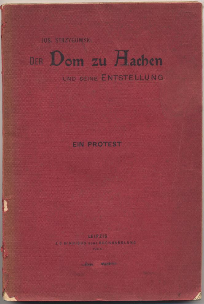 Strzygowski, Josef: Der Dom zu Aachen und seine Entstellung. Ein kunstwissenschaftlicher Protest. Leipzig: Hinrichs, 1904. 98 S. OBr. Kleinere Fehlstellen am Rücken, roter Fleck auf dem Titel (abgefärbt). [Bestell-Nr. 5898]