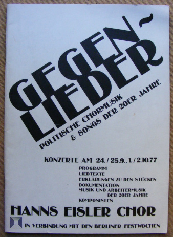 Gegenlieder. Politische Chormusik & Songs der 20er Jahre. Konzerte am 24./25.9., 1./2.10.77. Programm, Liedtexte, erklärungen zu den Stücken, Dokumentation, Komponisten. Hanns-Eisler-Chor in Verbindung mit den Berliner Festwochen. Berlin: Akademie der Künste, 1977. 60 S. OHeft. [Bestell-Nr. 7566]