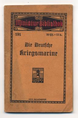 Die deutsche Kriegsmarine. Leipzig: Verlag für Kunst und Wissenschaft Albert Otto Paul, o.J. [ca. 1914]. 55 S. OHeft. (Miniatur-Bibliothek; 191). Wasserfleck m Schnitt. Vollständig umgearbeitet und vermehrte Auflage. [Bestell-Nr. 7649]