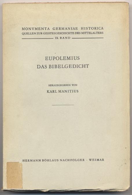 Manitius, Karl / Eupolemius: Das Bibelgedicht. Weimar: Hermann Böhlaus Nachfolger, 1973. 127 S. OBr. (Monumenta Germaniae Historica, Die deutschen Geschichtsquellen des Mittelalters 500-1500, Quellen zur Geistesgeschichte des Mittelalters; IX. Band). Ehemalige Bibliotheksexemplar mit Stempeln und entferntem Signaturschild. [Bestell-Nr. 8099]