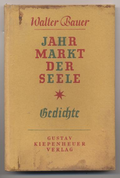 Bauer, Walter: Jahrmarkt der Seele. Gedichte. Berlin: Gustav Kiepenheuer, 1935. 68 S. OBr. Lädiert: Erheblicher Wasserschaden rundum vom Schnitt her, verzogen. [Bestell-Nr. 8153]