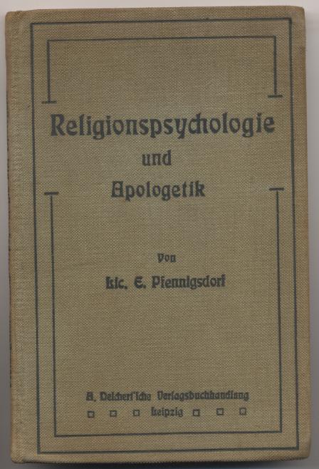 Pfennigsdorf, E.: Religionspsychologie und Apologetik. Leipzig: A. Deichert'sche Verlagsbuchhandlung, 1912. 96 S. OLn. Abgegriffen, innen fingerfleckig, Anstreichungen mit Bleistift im Literaturverzeichnis. [Bestell-Nr. 7413]