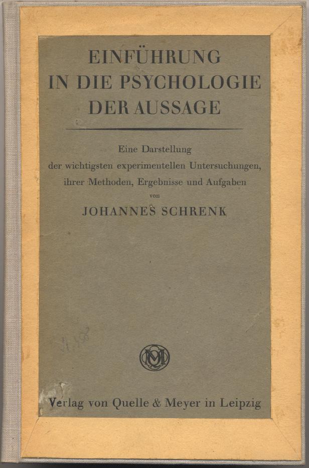 Schrenk, Johannes: Einführung in die Psychologie der Aussage. Eine Darstellung der wichtigsten experimentellen Untersuchungen, ihrer Methoden, Ergebnisse und Aufgaben. Leipzig: Quelle & Meyer, o.J. [1922] 106 S. Späteres Ln. Papier in der Bindung brüchig. [Bestell-Nr. 882]