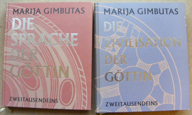 Gimbutas, Marija: Die Zivilisation der Göttin / Die Sprache der Göttin. Die Welt des Alten Europa / Das verschüttete Symbolsystem der westlichen Zivilisation. Frankfurt am Main: Zweitausendeins, 1996. 560, 416 S. OPp. Kanten berieben. Erste, bzw. dritte Auflage. [Bestell-Nr. 7542]