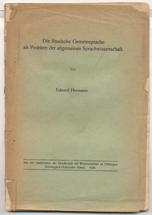 Hermann, Eduard: Die litauische Gemeinsprache als Problem der allgemeinen Sprachwissenschaft. [Göttingen:] 1929. Seite 65-125. OBr. Aus den Nachrichten der Gesellschaft der Wissenschaften zu Göttingen. Philologisch-Historische Klasse. Rücken lädiert, Deckel lose. [Bestell-Nr. 8074]