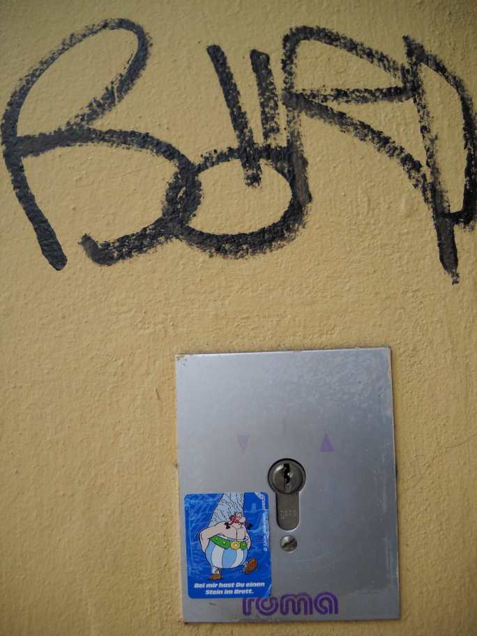örli börd und obelix sieht man hier im trauten reigen um das schlüsselloch, und ich wüsste beileibe bei beiden gern, wie sie dorthin gelangt sind: